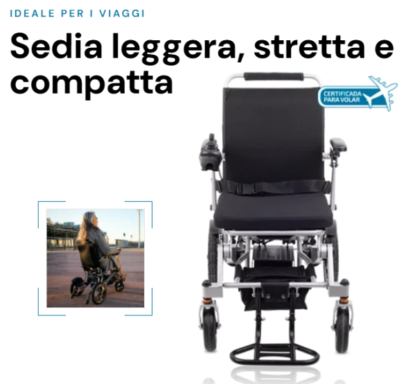 Compatta e leggeraLa carrozzina elettronica Kittos Travel è dotata di un telaio leggero e pieghevole. È un ausilio facile da utilizzare, adatto alla guida in luoghi sia chiusi sia all’aperto. Con una larghezza totale di 53,50 cm, la Kittos Travel è progettata per passare agevolmente attraverso porte e corridoi stretti, facilitando la mobilità in spazi ridotti. Il peso complessivo, senza batterie, è di soli 19,90 kg, caratteristica che la rende estremamente leggera e facile da manovrare. Questi aspetti rendono Kittos Travel una delle carrozzine più compatte e leggere disponibili sul mercato.