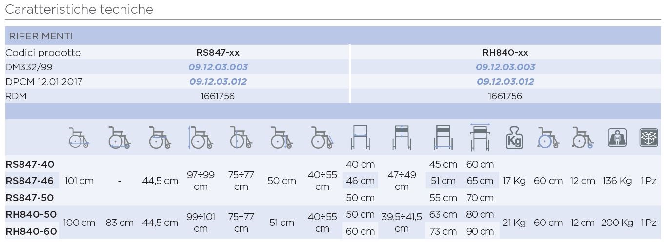 2 ruote posteriori con sistema quick release Ø 60 cm, 2 ruote anteriori piroettanti Ø 12,5 cm.