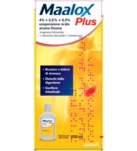 4% + 3,5% + 0,5% SOSPENSIONE ORALE AROMA MENTA FLACONE IN PET DA 250 ML L’alluminio idrossido può causare stitichezza e un sovradosaggio di sali di magnesio può causare ipermotilità dell’intestino (vedere paragrafo 4.8); alte dosi di questo medicinale possono causare o aggravare l’ostruzione intestinale e dell’ileo nei pazienti a più alto rischio, come quelli con compromissione renale, con stipsi di base, con alterazione della motilità intestinale, in bambini (da 0 a 24 mesi), o anziani (vedere paragrafo 4.9). L’alluminio idrossido non è ben assorbito dal tratto gastrointestinale, e gli effetti sistemici sono quindi rari in pazienti con una normale funzionalità renale. Tuttavia, dosi eccessive o uso a lungo termine, o anche dosi normali in pazienti con diete povere di fosforo o in bambini (da 0 a 24 mesi), possono portare ad eliminazione del fosfato (a causa di un legame alluminio-fosfato) accompagnata da un aumento del riassorbimento osseo e ipercalciuria con rischio di osteomalacia (vedere paragrafo 4.8). Si consiglia di monitorare i pazienti in caso di un uso a lungo termine o i pazienti a rischio di ipofosfatemia. Nei pazienti con compromissione renale i livelli plasmatici di alluminio e magnesio tendono ad aumentare causando rispettivamente iperalluminemia e ipermagnesiemia. In questi pazienti, lunghe esposizioni ad alte dosi di sali di alluminio e magnesio possono condurre a encefalopatie, demenza, anemia microcitica o al peggioramento di osteomalacia da dialisi.In presenza di forme lievi e moderate di compromissione renale, il medicinale deve essere assunto sotto il controllo del medico e deve essere evitato l’uso prolungato del medicinale. La somministrazione di questo medicinale in soggetti affetti da forme gravi di insufficienza renale è controindicato (vedere paragrafo 4.3). L’alluminio idrossido può non essere sicuro in pazienti affetti da porfiria sottoposti ad emodialisi; MAALOX PLUS è controindicato nei pazienti affetti da porfiria (vedere paragrafo 4.3). MAALOX PLUS, per la sua composizione, non ha tendenza a modificare il comportamento dell’alvo. Tuttavia, in alcuni soggetti particolarmente sensibili e per dosaggi elevati, è possibile il verificarsi di un’accelerazione del transito intestinale. Questo medicinale contiene 448 mg di sorbitolo in 10 ml (2 cucchiaini). Ai pazienti con intolleranza ereditaria al fruttosio non deve essere somministrato questo medicinale. Questo medicinale contiene meno di 1 mmol (23 mg) di sodio per dose, cioè è essenzialmente ‘senza sodio’. Popolazione pediatrica: Nei bambini piccoli l’uso di magnesio idrossido può portare a ipermagnesemia, in particolare se presentano danno renale o disidratazione. Conservare a temperatura inferiore a 30°C. Per le condizioni di conservazione dopo la prima apertura vedere paragrafo 6.3. Posologia: Ingerire 2-4 cucchiaini (10-20 ml) di sospensione orale 4 volte al giorno, 20-60 minuti dopo i pasti e prima di coricarsi. Può essere diluito in acqua o latte. Non superare la dose massima indicata di 16 cucchiaini. Popolazione pediatrica: MAALOX PLUS è controindicato nei bambini e negli 18 anni al di sotto dei 18 anni di età (vedere paragrafo 4.3). Modo di somministrazione: Per uso orale. Agitare bene prima dell’uso. - Ipersensibilità ai principi attivi o ad uno qualsiasi degli eccipienti, elencati al paragrafo 6.1. - Pazienti affetti da porfiria (vedere paragrafo 4.4). - Forme gravi di insufficienza renale (clearance della creatinina inferiore a 30 mL/min) (vedere paragrafo 4.4). - Controindicato in età pediatrica (vedere paragrafo 4.2). - Stato di cachessia. Trattamento sintomatico dell’iperacidità (inclusi bruciore e dolore) anche in caso di esofagiti, e dell’iperacidità quando accompagnata da dispepsia. Trattamento sintomatico del gonfiore gastro-intestinale quando accompagnato da iperacidità. Domifene bromuro, acido citrico monoidrato, saccarina sodica, sorbitolo liquido al 70% non cristallizabile (E420), metilcellulosa, idrossipropilcellulosa, cellulosa microcristallina e carmellosa sodica, idrogeno perossido soluzione 30%, aroma di limone, aroma di crema svizzera e acqua depurata.100 ml di sospensione contengono: Principi attivi: magnesio idrossido 4,0 g; alluminio idrossido 3,5 g; equivalente ad alluminio ossido 2,3 g; simeticone 0,50 g. Eccipienti con effetti noti: 10 ml contengono 0,348 mg di sodio e 448 mg di sorbitolo. Per l’elenco completo degli eccipienti, vedere paragrafo 6.1. La frequenza degli effetti indesiderati di seguito riportati è definita utilizzando le seguenti convenzioni: Comune (≥1/100, <1/10); non comune (≥1/1.000, <1/100); raro (≥1/10.000, <1/1.000); molto raro (<1/10.000); non nota (la frequenza non può essere definita sulla base dei dati disponibili). Disturbi del sistema immunitario. Frequenza non nota: angioedema, reazioni anafilattiche, reazioni di ipersensibilità, orticaria, prurito. Patologie gastrointestinali. Non comune: diarrea o stipsi (vedere paragrafo 4.4); Frequenza non nota: dolore addominale. Disturbi del metabolismo e della nutrizione. Molto raro: ipermagnesiemia, comprese le osservazioni dopo somministrazione prolungata a pazienti con danno renale; Frequenza non nota: iperalluminemia, ipofosfatemia, durante l’uso prolungato o ad alte dosi o anche a dosi normali del medicinale in pazienti con diete povere di fosforo o in bambini (da 0 a 24 mesi), che può causare un aumento del riassorbimento osseo, ipercalciuria, osteomalacia (vedere paragrafo 4.4). Segnalazione delle reazioni avverse sospette. La segnalazione delle reazioni avverse sospette che si verificano dopo l’autorizzazione del medicinale è importante, in quanto permette un monitoraggio continuo del rapporto beneficio/rischio del medicinale. Agli operatori sanitari è richiesto di segnalare qualsiasi reazione avversa sospetta tramite il sistema nazionale di segnalazione all’indirizzo http://www.aifa.gov.it/content/segnalazioni-reazioni-avver