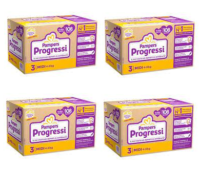 4 confezioni Quadripack di Pampers' Progressi taglia 3 Midi (108 pannolini a confezione / 432 pannolini totali).