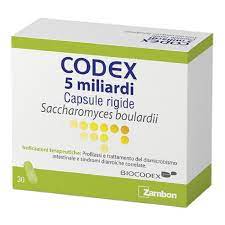 Saccharomyces boulardii. Pazienti in condizioni critiche o pazienti immunocompromessi, a causa del rischio di fungemia (vedere paragrafo 4.4.). Profilassi e trattamento del dismicrobismo intestinale e sindromi diarroiche correlate. Codex 5 miliardi capsule rigide. Ogni capsula contiene: lattosio; magnesio stearato; gelatina; titanio diossido.Codex 5 miliardi capsule rigide. Ogni capsula contiene: principio attivo: